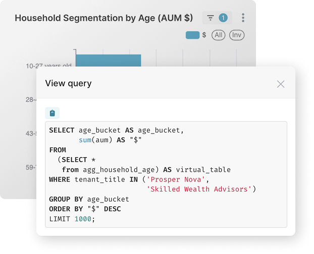 Enable advisors, operations, compliance, and executives to explore data, build dashboards, and answer questions—without coding.