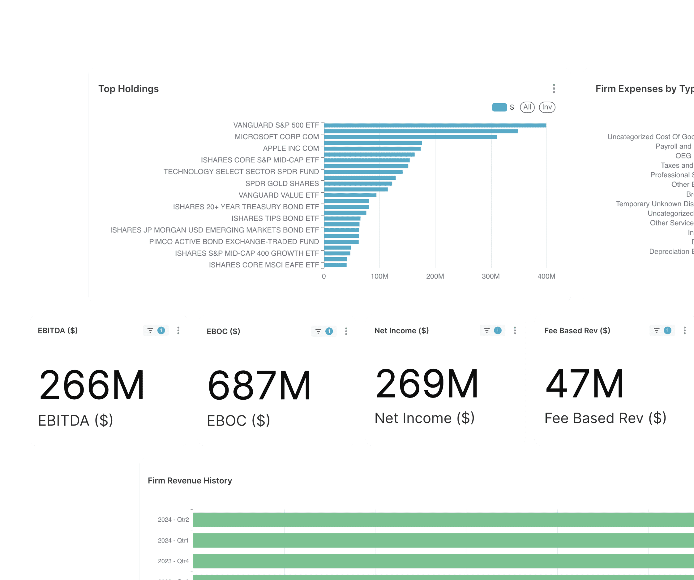- Ideal for tracking AUM, account flows, onboarding statuses, and advisor productivity in wealth management.
