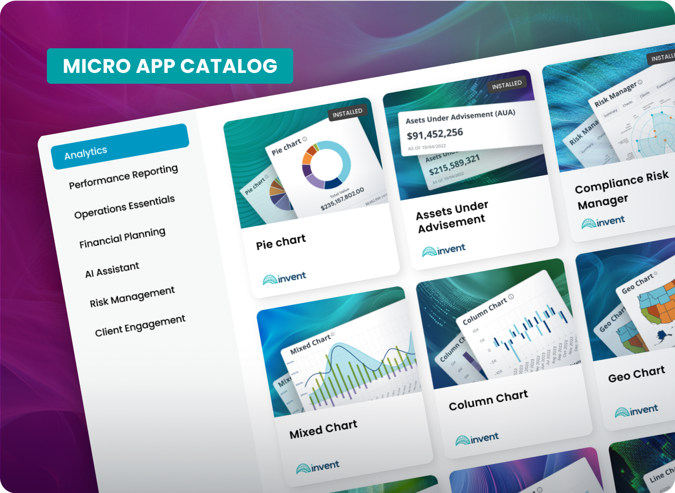 Invent Store features a range of applications tailored for wealth management, including tools for CRM integration, portfolio analytics, client reporting, compliance, financial planning, and data integration bundles designed to streamline your operations.