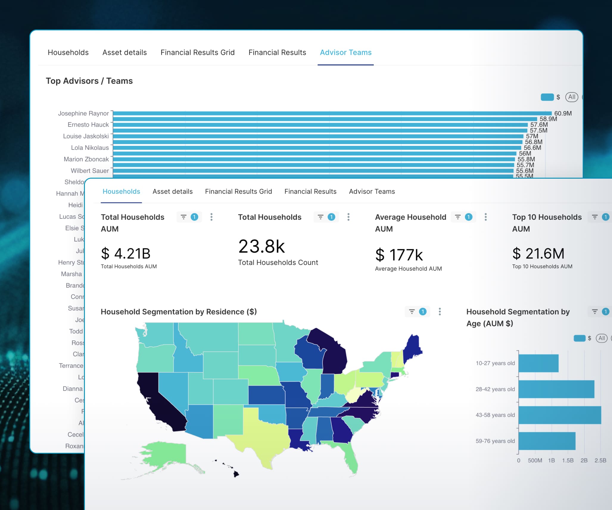 - Drill down into clients, accounts, AUM, revenue, and onboarding pipelines
